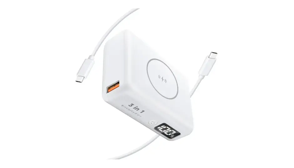 ケーブルを忘れても大丈夫。Qi対応のワイヤレス充電機能を搭載しているので、対応スマホを重ねてボタンを押すだけで給電開始。 さらに、LCDディスプレイで残量を1%単位で表示。「あとどのくらい使えるのか」一目でわかる安心感は、小型モデルでは貴重です。