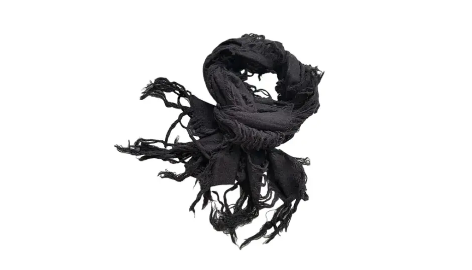 このスカーフの一番の特徴は、わざと“整えない”デザイン。 ダメージ加工と不規則なカットが、まるで一点モノのようなヴィンテージ感を演出しています。